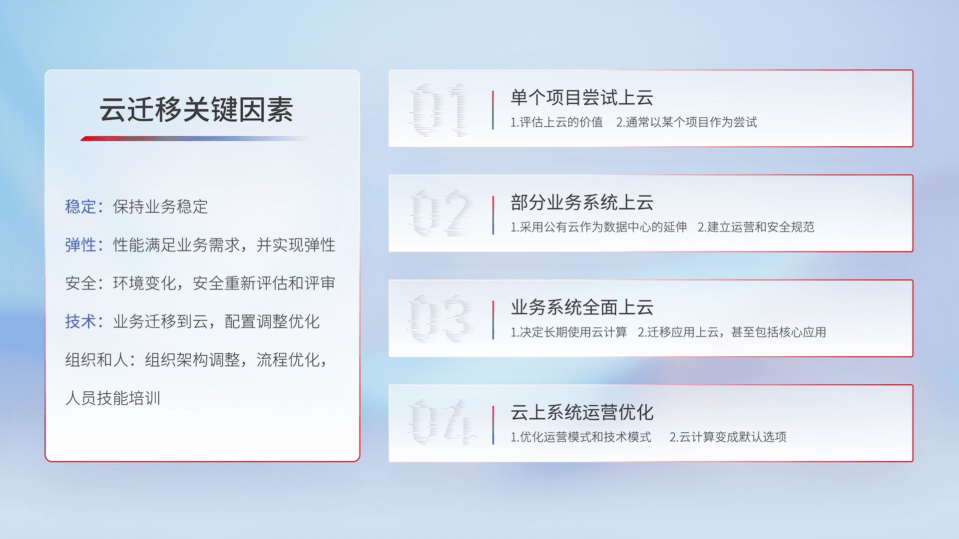 结合实际业务,,从规划设计、、、、云平台选型、、、、云原生改造、、、、数据迁移、、集成交付,,,,迁移全过程为客户识别最佳上云路径,,,做好风险识别管理,,,,设计网络架构、、身份权限、、、、安全审计合规、、、、操作审计、、、、日志审计、、、监控告警策略、、、、多站点容灾设计等,,,,对云上基础设施进行整体规划,,,提升IT治理水平,,,,以满足弹性、、、、高可用、、、高性能的需求。。。。