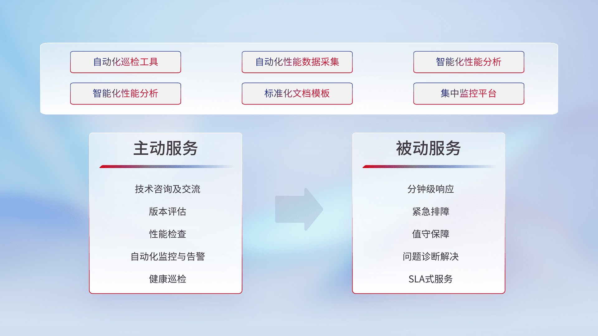 智能化工具和标准化文档,,保障服务质量,,提供主动服务(包含技术咨询、、版本评估、、性能检查、、自动化监控与告警、、、、健康巡检)和被动服务包含(分钟级响应、、紧急排障、、、、值守保障、、、、问题诊断解决、、、、SLA服务)。。