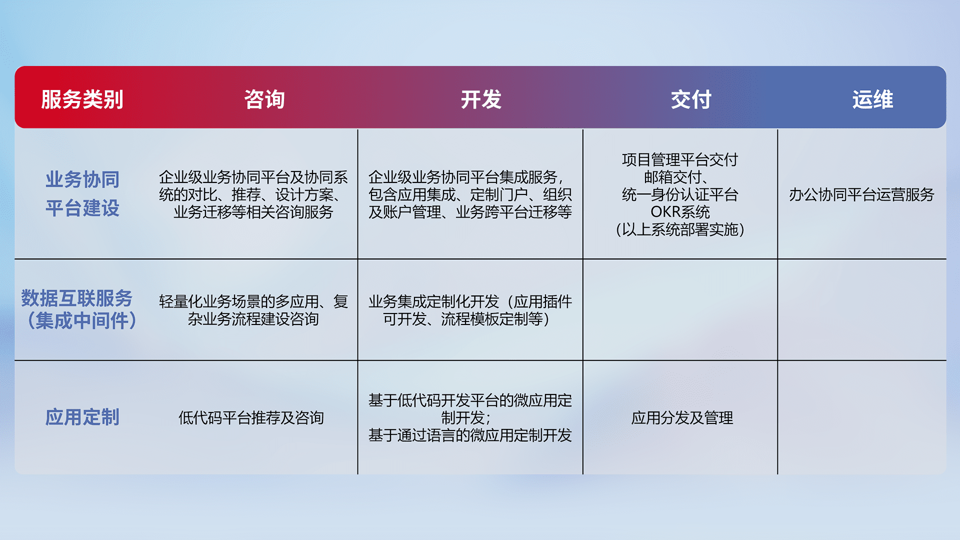 针对钉钉、、、、企微、、、IDaas等平台级产品提供产品的规划、、、方案、、交付、、、、定制化开发等服务,,,实现如统一协同办公、、、智能客户服务、、混合会议管理、、智能数据查询、、、等业务场景,,实现数字化转型。。